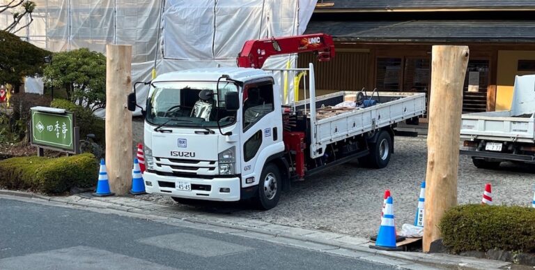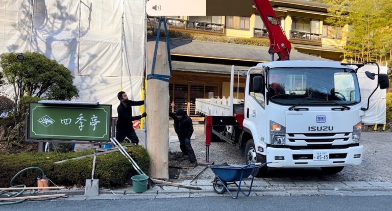 つなぎ温泉四季亭の新しい門柱を建て込んできました。